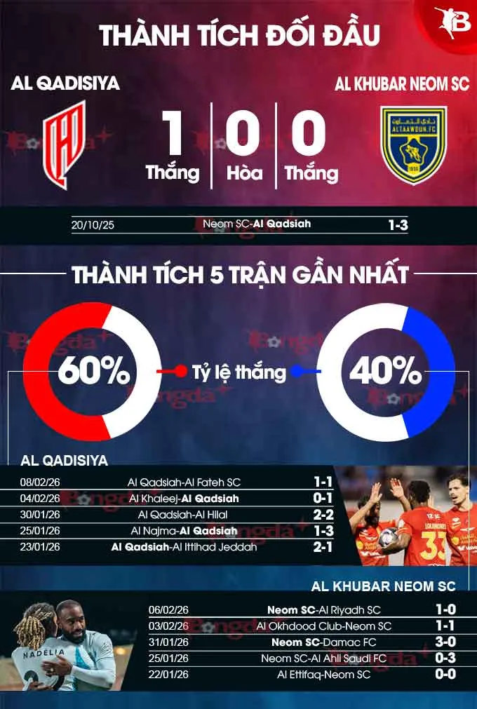 Lịch sử đối đầu cũng nghiêng về phía Al Qadsiah. Ở lượt đi mùa này, họ đã có màn trình diễn thuyết phục khi đánh bại Neom SC với tỷ số 3-1 ngay trên sân khách, nhờ cú hat-trick của tiền đạo Julian Andres Quinones.