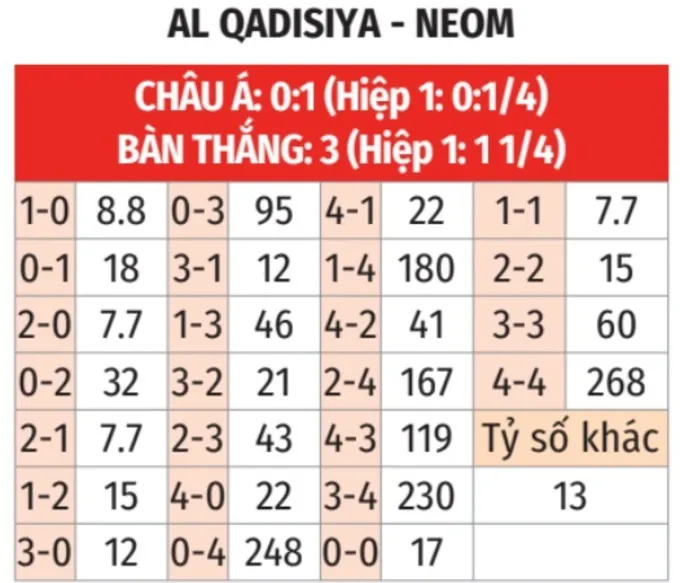 - Trận đấu nhiều bàn: 8/10 trận gần nhất của Al Qadsiah và 6/9 trận gần đây của Neom SC đều chứng kiến ít nhất 3 bàn thắng được ghi.