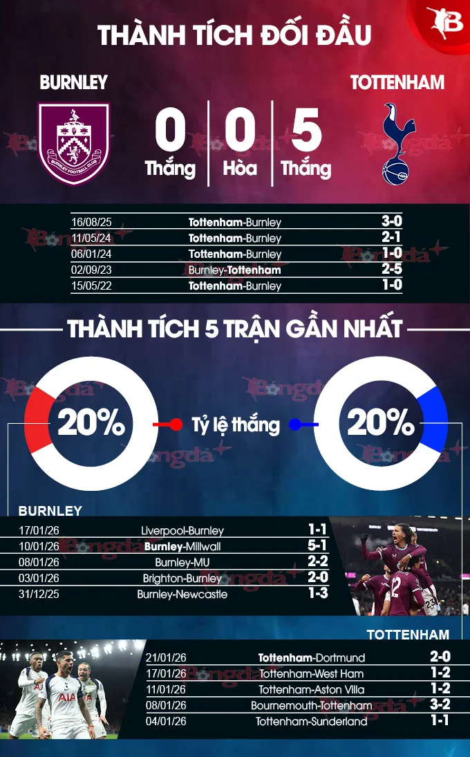 - Trận đấu nhiều bàn: 3 lần gặp nhau gần đây tại Ngoại hạng Anh đều có từ 3 bàn thắng trở lên. Xu hướng này cũng xuất hiện ở 4/5 trận sân nhà gần nhất của Burnley và 3/4 trận sân khách mới đây của Tottenham.