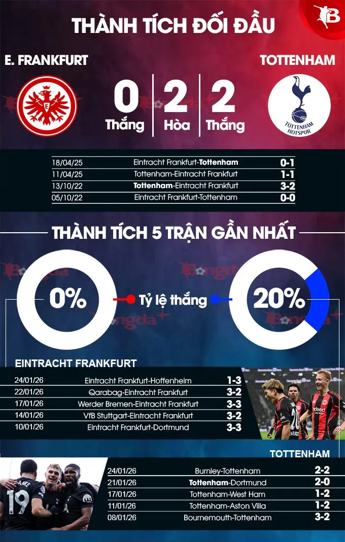 Lịch sử đối đầu cũng ủng hộ Tottenham khi họ chưa từng để thủng lưới trong 2 lần làm khách trước Frankfurt. Điều này củng cố thêm niềm tin vào khả năng kiểm soát trận đấu của đội bóng thành London.