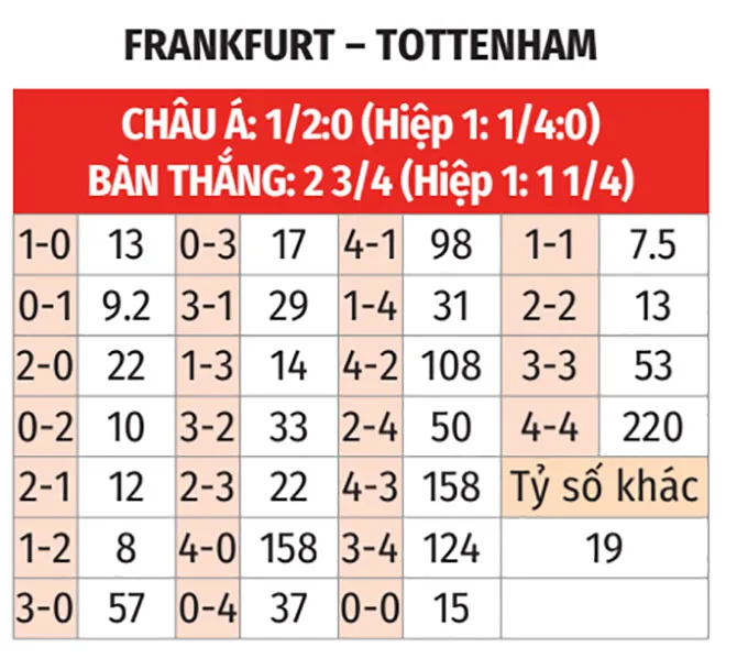 - Lợi thế kèo châu Á: Tottenham thắng kèo châu Á trong 3/4 trận sân khách gần nhất tại Champions League. Trong khi đó, Frankfurt đã thua kèo ở 3/4 trận vừa qua.